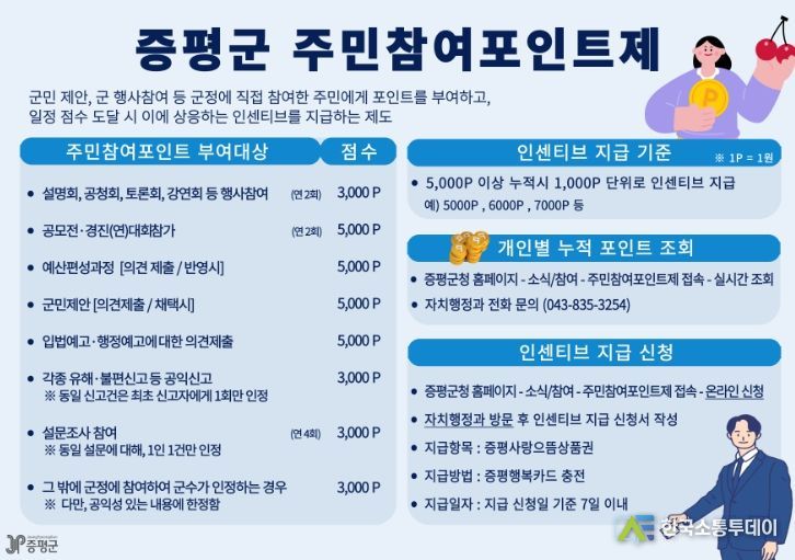한국소통투데이 관리자 기자 | 충북 증평군이 주민 참여 활성화를 위해 시행하는 주민참여포인트제 실효성 높이기에 나섰다.