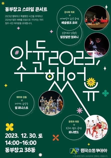 청주시문화산업진흥재단이 올해의 마지막 토요일인 30일 오후 2시 동부창고 38동에서 '스마일 콘서트-아듀 2023, 수고했어유'를 연다.
