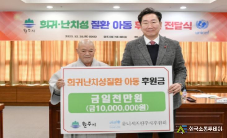 한국소통투데이 관리자 기자 | 유니세프 원주시후원회는 12월 28일 원주시청 7 층 회의실에서 희귀․난치성질환 아동을 위한 후원금 천만 원을 전달했다.