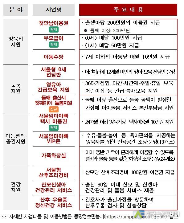 한편, 청룡의 해에 서울에서 태어난 신생아와 부모들이라면 소득자격 조건 없이 누구나 출산・돌봄・양육 등 다양한 지원 혜택을 받을 수 있다.