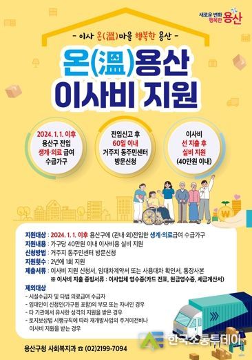 한국소통투데이 관리자 기자 | 서울 용산구가 기초생활수급가구의 주거 안정과 경제적 부담 경감을 위해 ‘2024년 온(溫)용산 이사비 지원’ 사업을 추진한다.