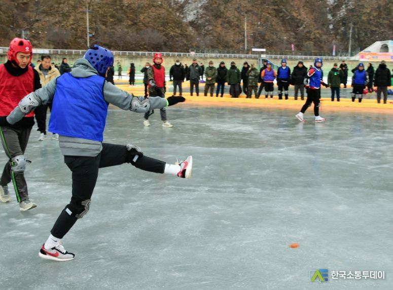 얼음축구대회는 빙판 위에서 안전장구를 착용한 5명이 1팀을 이뤄 상대방과 겨루는 단체 스포츠다.