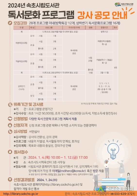 한국소통투데이 관리자 기자 | 속초시립도서관은 2024년도 상 하반기 독서문화 프로그램 및 방학특강 프로그램 강의를 담당할 역량 있는 강사를 공개모집한다.