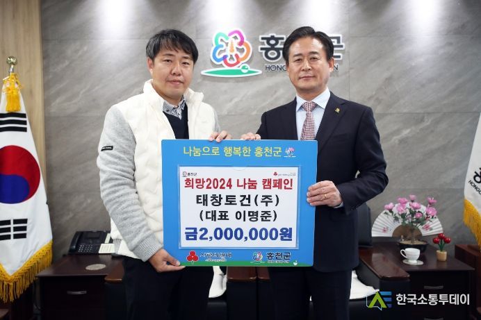 한국소통투데이 관리자 기자 | 태창토건(주)(대표 이명준)은 1월 3일 홍천군청을 방문하여 희망 2024 나눔캠페인에 성금 200만원을 기탁했다.