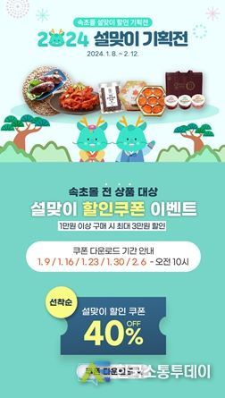 한국소통투데이 관리자 기자 | 속초시 공식 쇼핑몰인 속초몰에서 2024년 설 명절을 맞이하여 전 품목 할인쿠폰을 발행하는 설 특판 행사를 실시한다.