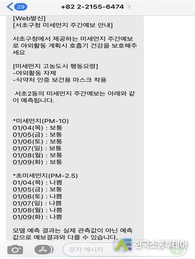 한국소통투데이 관리자 기자 | 띵동~ “서초2동 이번 주 미세먼지 예보입니다”