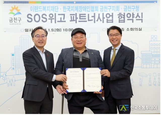 한국소통투데이 관리자 기자 | 금천구는 1월 9일 저소득 장애인 가족을 지원하기 위해 이랜드복지재단, 서울지체장애인협회 금천지회와 ‘SOS 위고 파트너 사업’ 업무협약을 체결했다.