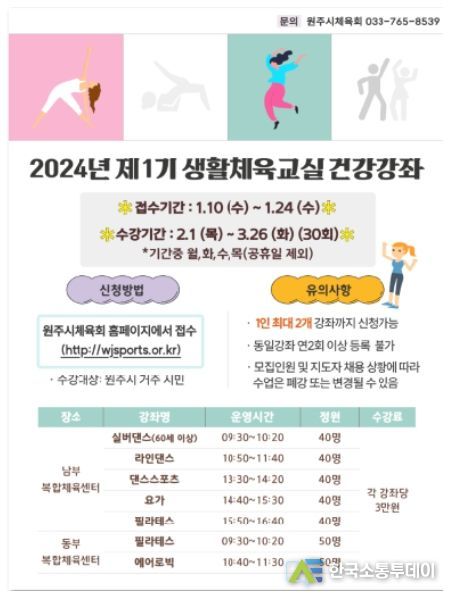 한국소통투데이 관리자 기자 | 원주시와 원주시체육회가 오는 10일부터 24일까지 ‘2024년 제1기 생활체육교실’ 건강강좌 수강생을 모집한다.