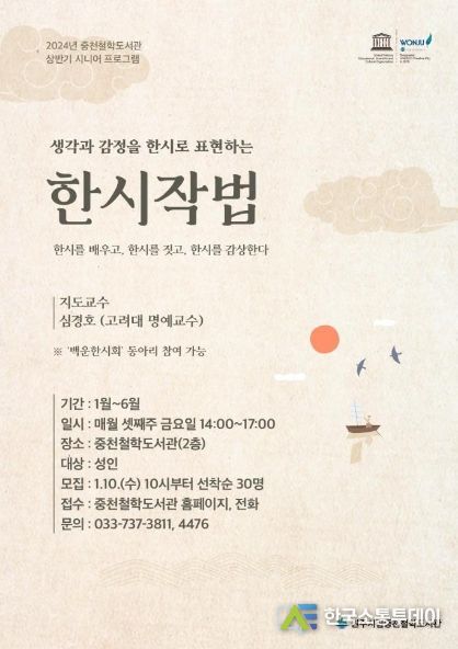 한국소통투데이 관리자 기자 | 중천철학도서관이 상반기 시니어 프로그램으로 ‘생각과 감정을 한시로 표현하는 한시작법’ 강의를 운영한다.