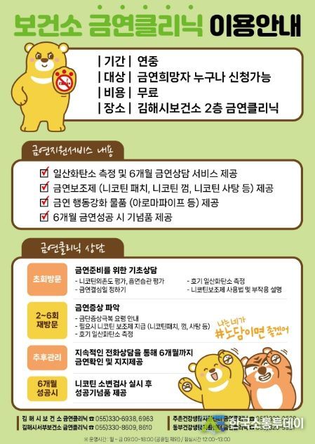 김해시보건소 2층에 위치한 금연클리닉은 평일 오전9시부터 오후6시까지 운영하며 금연을 희망하는 시민 누구나 이용 가능하며 김해시보건소 내소가 어려운 시민들은 김해시서부보건소, 동부건강생활지원센터, 주촌건강생활지원센터도 내소하여 상담이 가능하다.