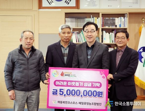 한국소통투데이 관리자 기자 | 하동군은 새해를 맞아 이웃사랑 행렬이 이어지는 가운데 북천 코스모스·메밀꽃영농조합법인(대표 김용수) 임원진이 지난 9일 군수 집무실을 찾아 이웃돕기 성금 500만원을 기탁했다고 10일 밝혔다.