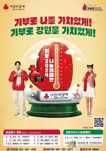 지난 2023년 12월 1일부터 시작된 희망2024 나눔캠페인은 기부로 나를 가치있게, 기부로 영월을 가치있게! 라는 슬로건으로 진행되고 있으며, 어려운 경제 여건 속에서도 많은 관내 기업 및 단체와 주민들의 기부 문의가 이어져 현재까지 1억 2천 6백만원 가량의 성금이 기탁됐다.