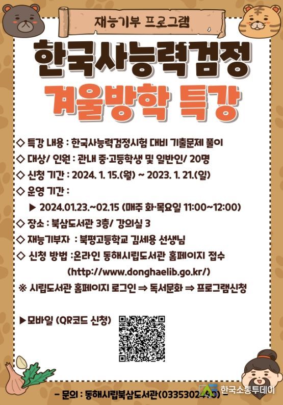 한국소통투데이 관리자 기자 | 동해시는 재능 기부를 통한 ‘한국사 능력검정시험 준비(심화) 겨울방학특강’을 운영한다고 밝혔다.