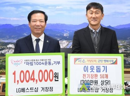 한국소통투데이 관리자 기자 | 거창군은 9일 프라임합창단에서 100만 4000원, 일성철물공구볼트에서 100만 4000원과 자녀 강지민 학생이 10만 400원을, 거창농식품수출진흥협회에서 100만 4000원을 아림1004후원금으로 기탁했으며, LG베스트샵 거창점에서도 아림1004후원금 100만 4000원과 전기장판 50개(300만 원 상당)를 함께 기탁했다고 밝혔다.