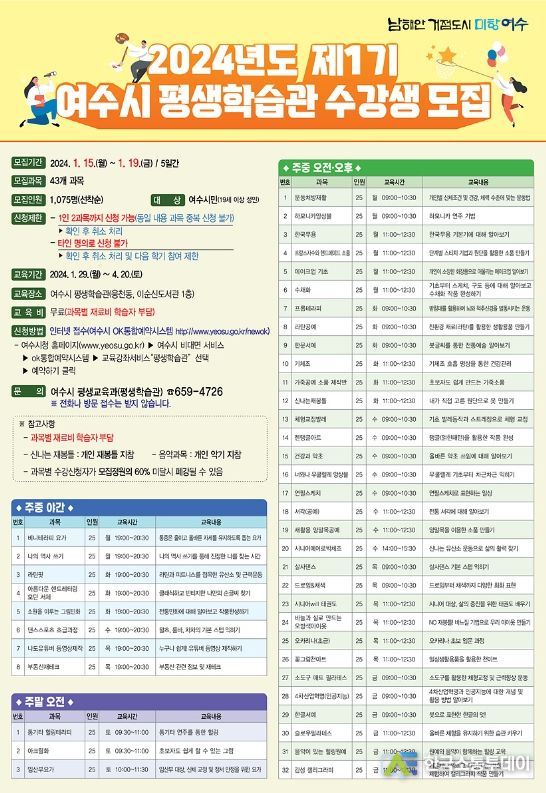한편, 평생학습관에서 배우고 싶은 강좌가 있는 시민은 여수시 홈페이지(OK통합예약-평생학습관-희망교육 추천)에서 연중 신청할 수 있다.