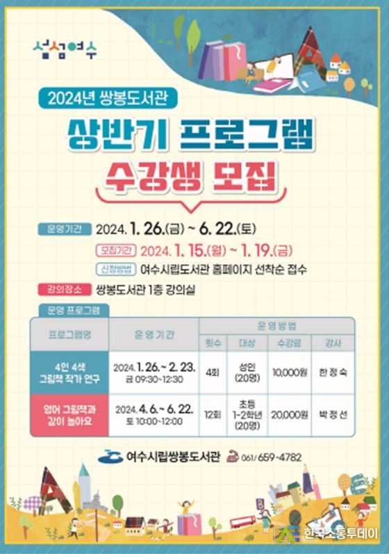 한국소통투데이 관리자 기자 | 여수시립쌍봉도서관에서 시민들을 대상으로 ‘상반기 프로그램’에 참여할 수강생을 오는 15일부터 19일까지 모집한다.