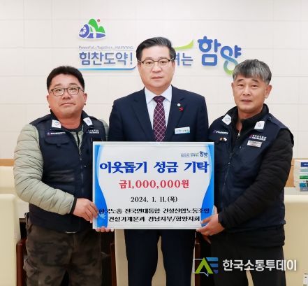 한국소통투데이 관리자 기자 | 함양군은 지난 11일 한국노총 전국연대통합 건설산업조합 건설기계분과 경남지부 함양지회에서 이웃돕기 성금 100만원을 전달했다고 밝혔다.