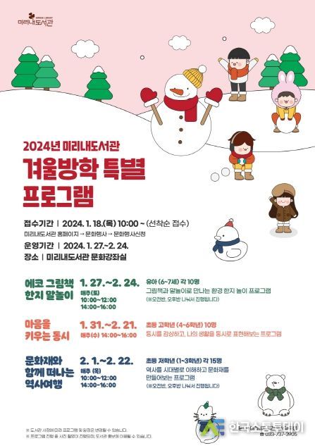 도서관 관계자는 “미리내도서관의 다양한 프로그램을 통해 아이들이 알찬 겨울방학을 보내길 바란다.”라고 전했다.
