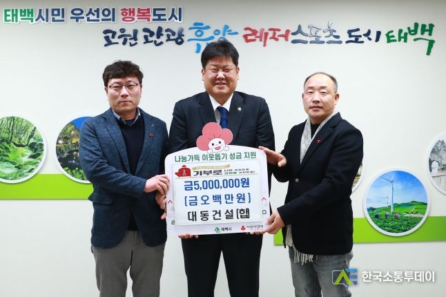 한국소통투데이 관리자 기자 | 합자회사 대동건설은 지난 11일 관내 어려운 이웃을 위해 사용해 달라며 성금 500만 원을 태백시에 기탁했다.