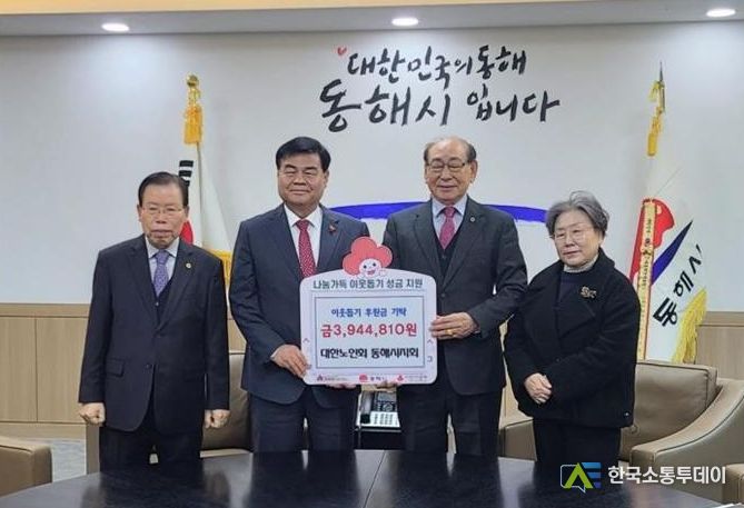 이어, 11일 (사)대한노인회 동해시지회는 관내 132개 경로당을 비롯한 경로당 영농사업단에서 십시일반 모아 마련한 3,944,810원을 희망2024나눔캠페인 성금으로, 동해시민장학금에 3,000,000원을 각각 기탁했다.