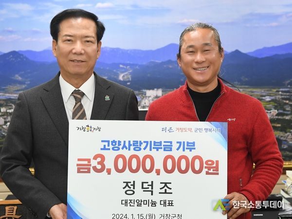 한국소통투데이 관리자 기자 | 거창군은 지난 15일 군수실에서 정덕조 대진알미늄(경북 고령군 소재) 대표가 고향사랑기부금 300만원을 군에 기부했다고 전했다.