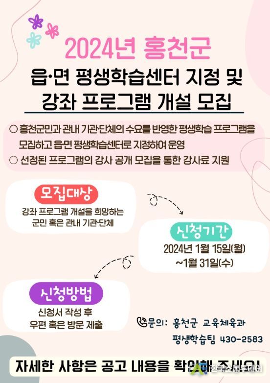 한편, 홍천군은 2024년에도 고등직업교육거점지구 사업, 평생학습 동아리 지원, 성인문해교육, 장애인 평생학습 지원 등 근거리에서 누구나 평생학습 기회를 누릴 수 있도록 다양한 사업을 추진하여 운영한다.