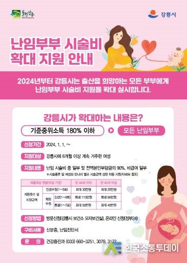 이와 더불어 강릉시는 도내 최초로 출산을 원하는 모든 부부에게 소득 제한 없이 난임부부 시술비 지원을 시작한다.
