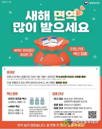 윤병근 방역관리과장은 “설을 앞두고 유동 인구가 증가함에 따라 코로나19 확산 예방이 필수적”이라며 “65세 이상 고령층과 감염 취약 시설 등 고위험군은 예방 접종에 적극 동참해 주길 바란다”라고 말했다.