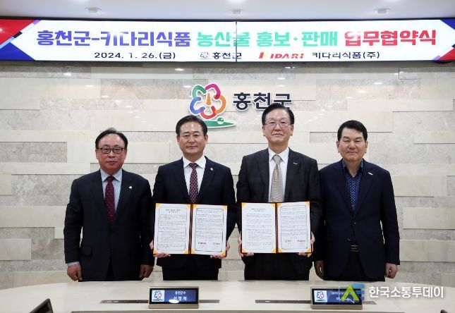 한국소통투데이 관리자 기자 | 홍천군은 지역 농산물의 홍보와 판매를 확대하고 홍천군 농산물의 청정 이미지를 제고하기 위해 1월 26일 군청 2층 행정상황실에서 ㈜키다리식품과 홍천(서울·양양방향)휴게소를 통한 업무협약을 맺었다.