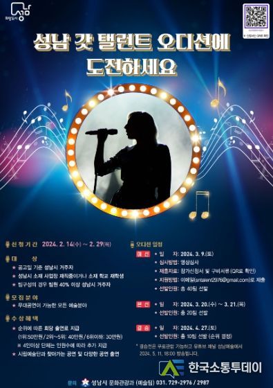 한국소통투데이 관리자 기자 | 성남시는 청년프로 예술단과 갓 탤런트 예술단을 10개 팀(명)씩 모두 20개 팀을 선발해 각종 공연 활동 지원에 나선다.