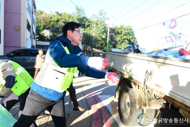 19일 정 시장은 쾌적한 도시환경을 위해 일하는 환경미화원 3명과 함께 마도 농협에서 시작해 재래시장까지 3㎞ 구간을 쓸고 생활폐기물 4톤을 수거했다.