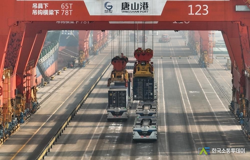 (중국 탕산=신화통신) 허베이(河北)성 탕산(唐山)항 징탕(京唐)항구구역 컨테이너 부두에서 무인 컨테이너 트럭이 컨테이너를 운반하는 모습을 7일 드론사진에 담았다.탕산시 해양통상구 및 항항(港航)관리국에 따르면 올 1월 탕산항의 화물 물동량이 전년 대비 13.40% 증가한 7천321만t(톤)을 기록했다. 2024.2.7