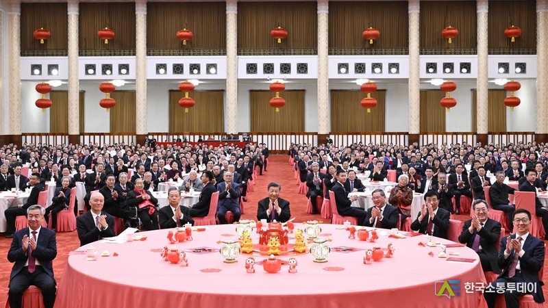 (베이징=신화통신) 중국공산당 중앙위원회와 국무원은 8일 베이징 인민대회당에서 '2024년 춘절(春節·음력설) 단배회(團拜會)' 행사를 열었다. 당과 국가 지도자인 시진핑(習近平)·리창(李强)·자오러지(趙樂際)·왕후닝(王滬寧)·차이치(蔡奇)·딩쉐샹(丁薛祥)·리시(李希)·한정(韓正) 등은 수도 각계 인사들과 한자리에 모여 새봄을 함께 맞이했다.이날 '2024년 춘절 단배회' 행사 현장. 2024.2.8