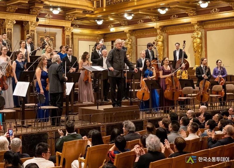 (빈=신화통신) 지난 11일(현지시간) 오스트리아 빈 무지크페라인에서 열린 공연에서 연주자들이 시작 전 관객에게 인사를 하고 있다.이날 '2024 중국 신년 음악회'가 오스트리아 수도 빈 골든홀에서 열렸다. 2024.2.13