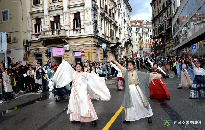 (크로아티아 리예카=신화통신) 크로아티아 자그레브대학교 공자학원과 리예카 오수처리장 프로젝트를 건설 중인 중국에너지건설그룹 장쑤(江蘇)성전력설계원회사가 지난 11일 팀을 이뤄 '리예카 카니발'의 퍼레이드에 참가했다. 참가단은 용춤·전통의상 등 중국 문화를 선보였다.크로아티아의 리예카 카니발 퍼레이드에 참가한 중국 참가단이 11일 전통의상을 입고 공연하고 있다. 2024.2.13