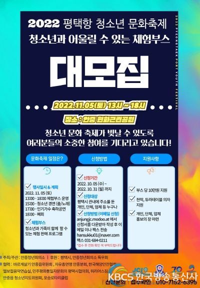 한국방송통신사 관리자 기자 | 안중청년회의소(회장 한석구)에서는 2022년 평택항 청소년 문화축제에 참가할 문화체험 부스 20팀과 노래·춤 경연에 도전할 청소년 경연 12팀을 모집하고 있다.