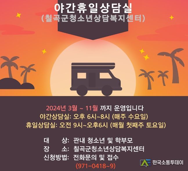 한국소통투데이 관리자 기자 | 칠곡군청소년상담복지센터는 오는 3월 2일부터 청소년 상담복지사각지대 해소를 위해 야간·토요상담실을 운영한다