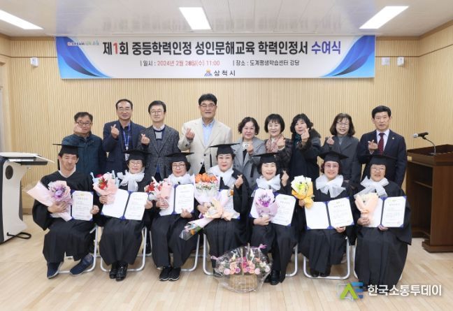 삼척시는 2월28일 수요일 도계평생학습센터 강당에서 박상수 시장과 양희전 삼척시의회 부의장을 비롯한 내빈과 교사, 가족 등 50여명이 참석한 가운데 제1회 중학학력인정 성인문해교실 학력인증서 수여식을 개최했다.