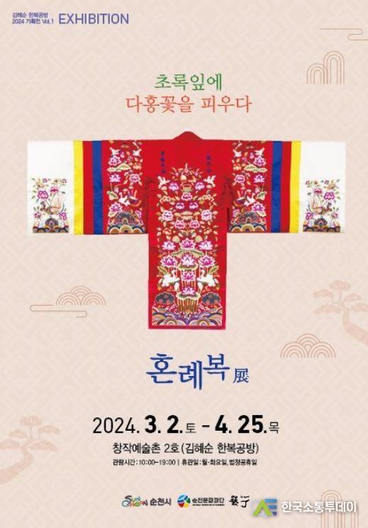 한국소통투데이 관리자 기자 | 순천문화재단에서 운영하는 순천 창작예술촌 2호 ‘김혜순 한복공방’이 전통 혼례복을 주제로 한 '초록잎에 다홍꽃을 피우다' 전을 개최한다.