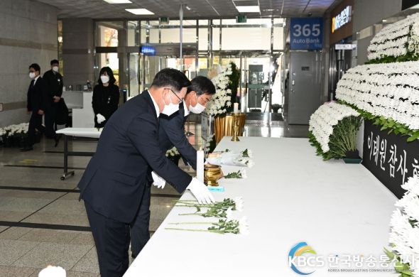 한국방송통신사 관리자 기자 | 강수현 양주시장을 비롯한 간부 공무원들이 3일 경기도 북부청사에 마련된 이태원 사고 사망자 합동분향소에서 찾아 헌화와 묵념을 하며 조문했다.