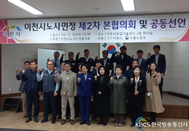 한국방송통신사 관리자 기자 | 이천시노사민정협의회는 11월3일 이천시농업기술센터 2층 회의실에서 본협의회·실무협의회·공동주택종사자권익증진 분과위원 등 25명이 참석한 가운데 2022년 제2차 이천시노사민정협의회 본협의회 및 공동선언식를 개최했다.