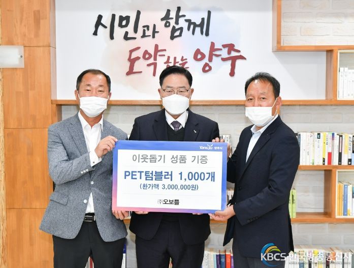 한국방송통신사 관리자 기자 | 양주시는 지난 9일 (주)오보틀이 시청을 방문해 PET텀블러 1,000개를 기부했다고 밝혔다.