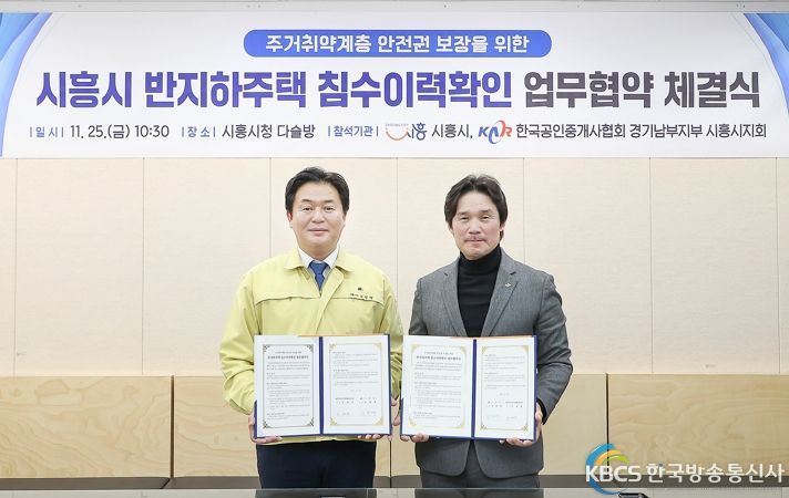 한국방송통신사 관리자 기자 | 시흥시는 25일 시흥시청 다슬방에서 한국공인중개사협회 시흥시지회와'반지하주택 침수이력확인 업무협약'을 체결했다.