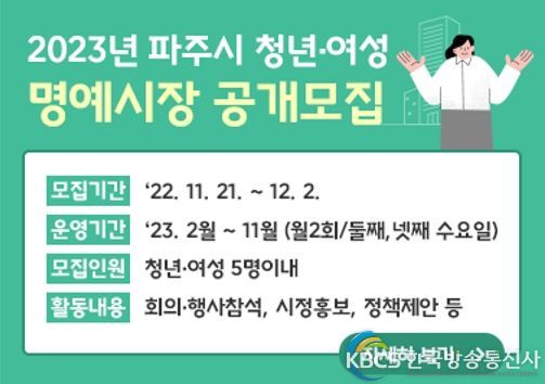 한국방송통신사 관리자 기자 | 파주시는 시민들의 시정 참여 기회를 확대하고 다양한 시민들의 의견을 시정에 반영하기 위해 청년과 여성, 청소년, 장애인 등 각 분야의 시민을 일일명예시장으로 임명할 예정이라고 밝혔다.