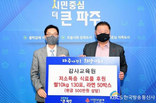 한국방송통신사 관리자 기자 | 파주시는 8일 감사교육원에서 파주시 취약계층을 위해 현금 500만원 상당의 쌀 1,300kg과 라면 50박스를 전달받았다고 밝혔다.