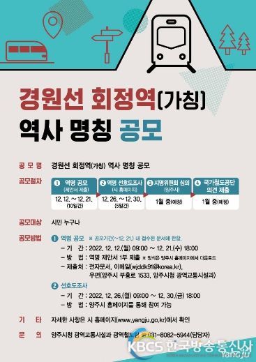 한국방송통신사 관리자 기자 | 양주시는 회정동 698번지 일원에 신설되는 회정역(가칭)에 대한 역명 제정을 위해 양주시민을 대상으로 명칭 공모를 실시한다.