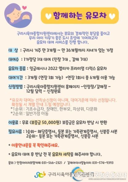 한국방송통신사 관리자 기자 | 구리시는 오는 13일부터 구리시육아종합지원센터를 통해 출산가정의 경제적 부담을 줄이기 위한 유모차 대여사업을 추진한다.
