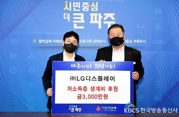 한국방송통신사 관리자 기자 | 파주시는 13일 ㈜LG디스플레이(대표이사 정호영)에서 파주시 취약계층을 위한 후원금 3천만원을 전달받았다고 밝혔다.