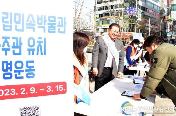 한국방송통신사 관리자 기자 | ‘국립민속박물관 파주관 유치 서명운동’ 어깨띠를 두른 김경일 파주시장은 15일 금릉역 중앙광장에서 시민들을 직접 만나 홍보물을 나눠주며 서명운동에 동참해 줄 것을 독려했다.