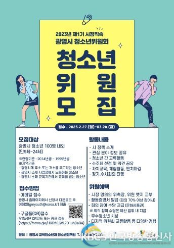 시는 오는 27일부터 3월 24일까지 광명시에 거주하거나 교육·근로 활동하는 만 9~24세 청소년을 대상으로 총 100명 내외의 청소년위원회 참가자를 모집한다.